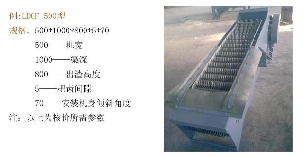 設(shè)備規(guī)格按機(jī)寬尺寸分LDGF300-3600型。機(jī)寬超過1800mm,則做成并聯(lián)機(jī),中間部分共用墻板。耙齒間隙分為1mm、3mm、5mm、10mm、15mm、20mm、30mm、40mm、50mm需求規(guī)格。選型由過水量、提升速度、固液分離總量和所分離物質(zhì)的形狀、顆粒大小來選擇,同時選配不同的材質(zhì)。